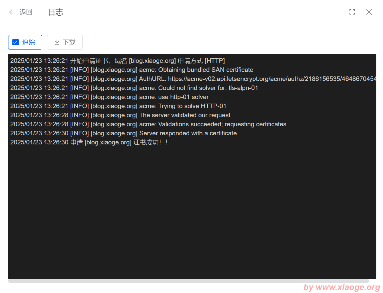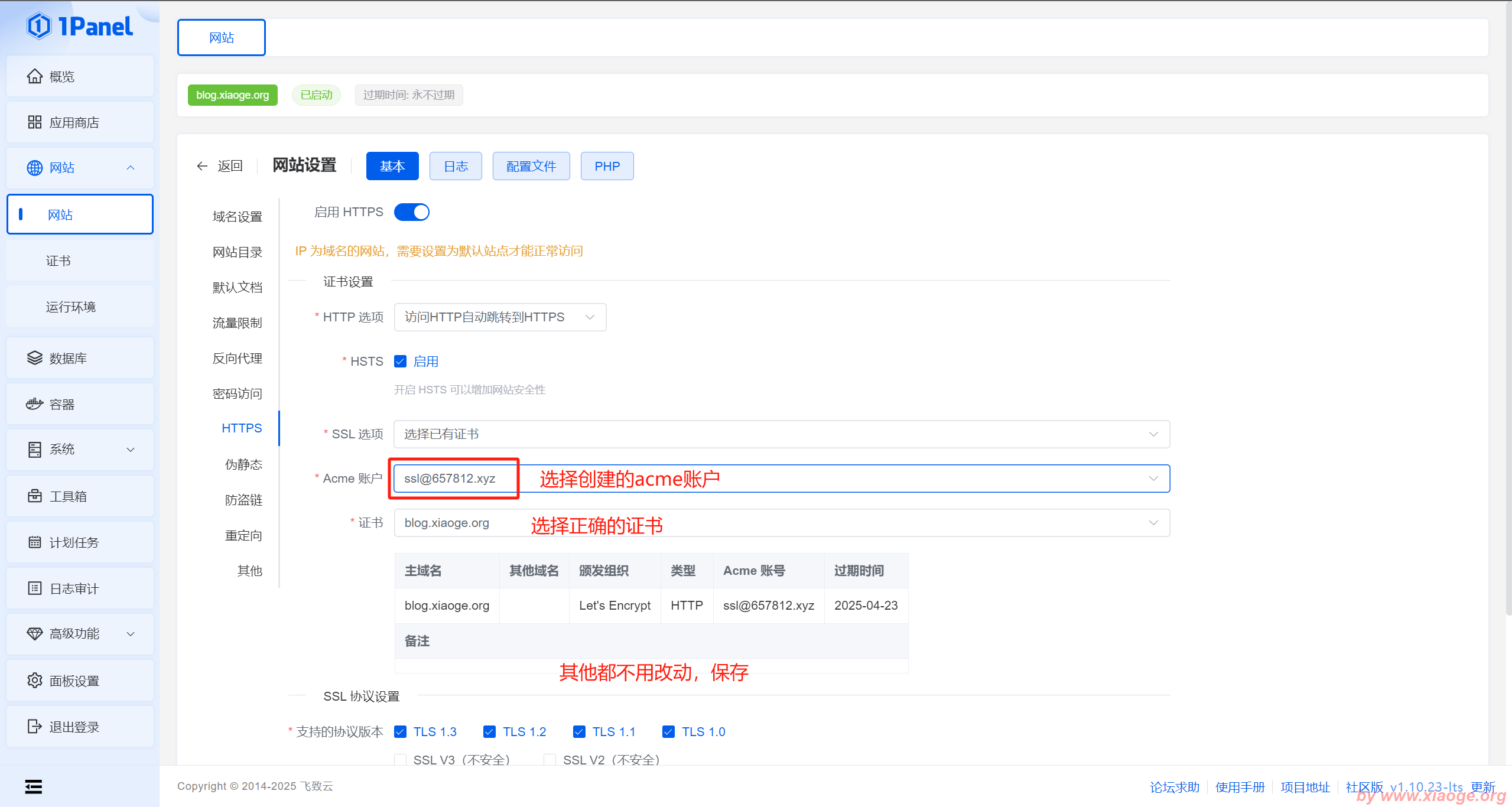 HTTPS:选择创建的acme账户,然后选择正确SSL证书;