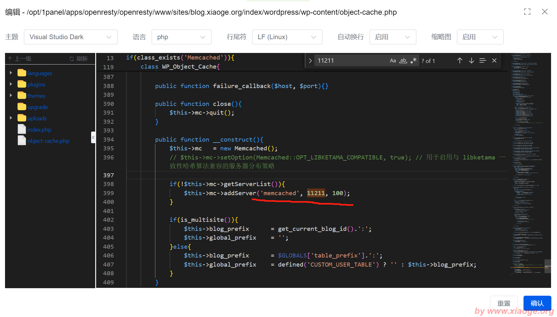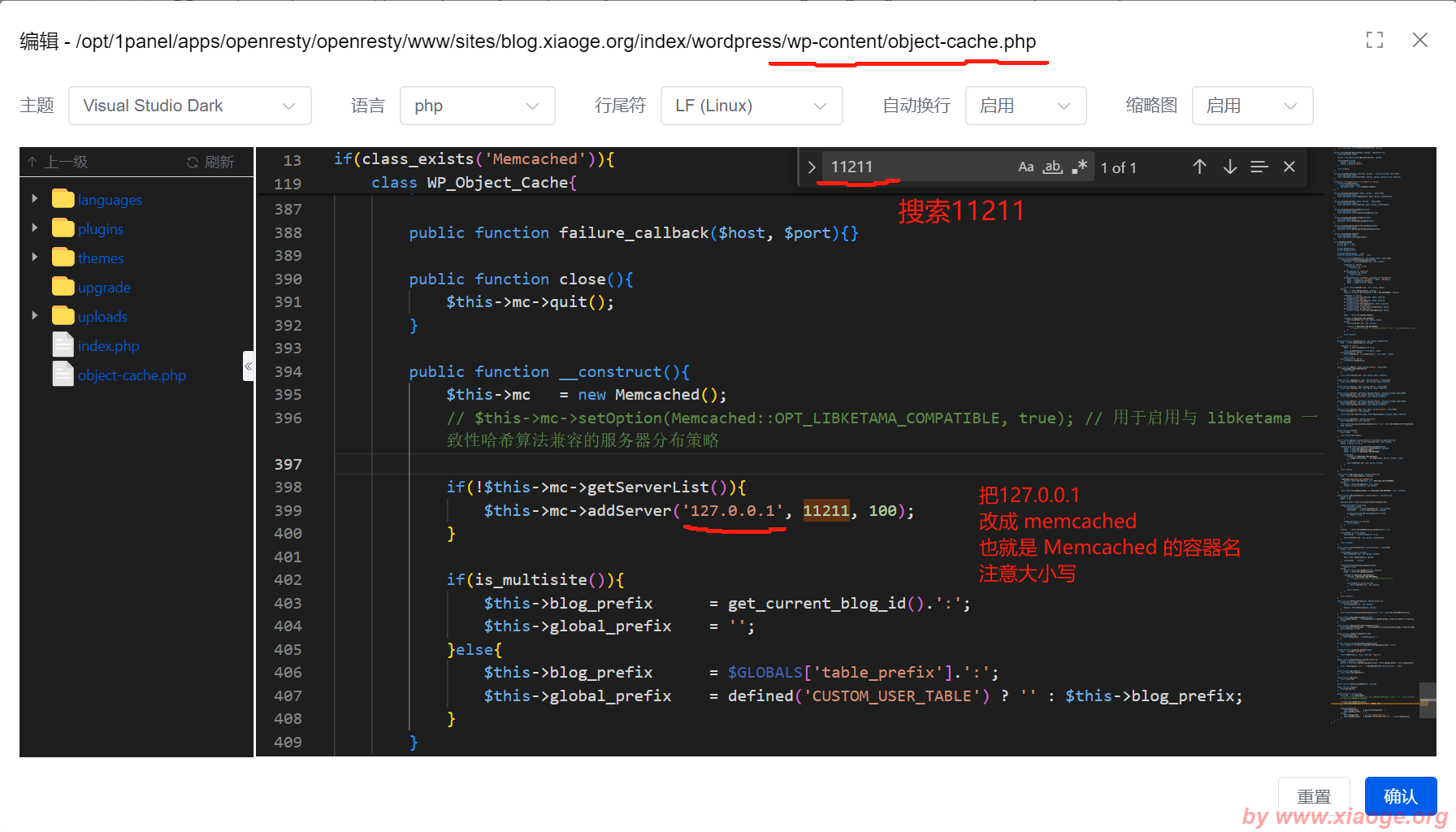 修改wp-content 目录下的object-cache.php 文件,搜索:11211,把127.0.0.1 改成 memcached ;