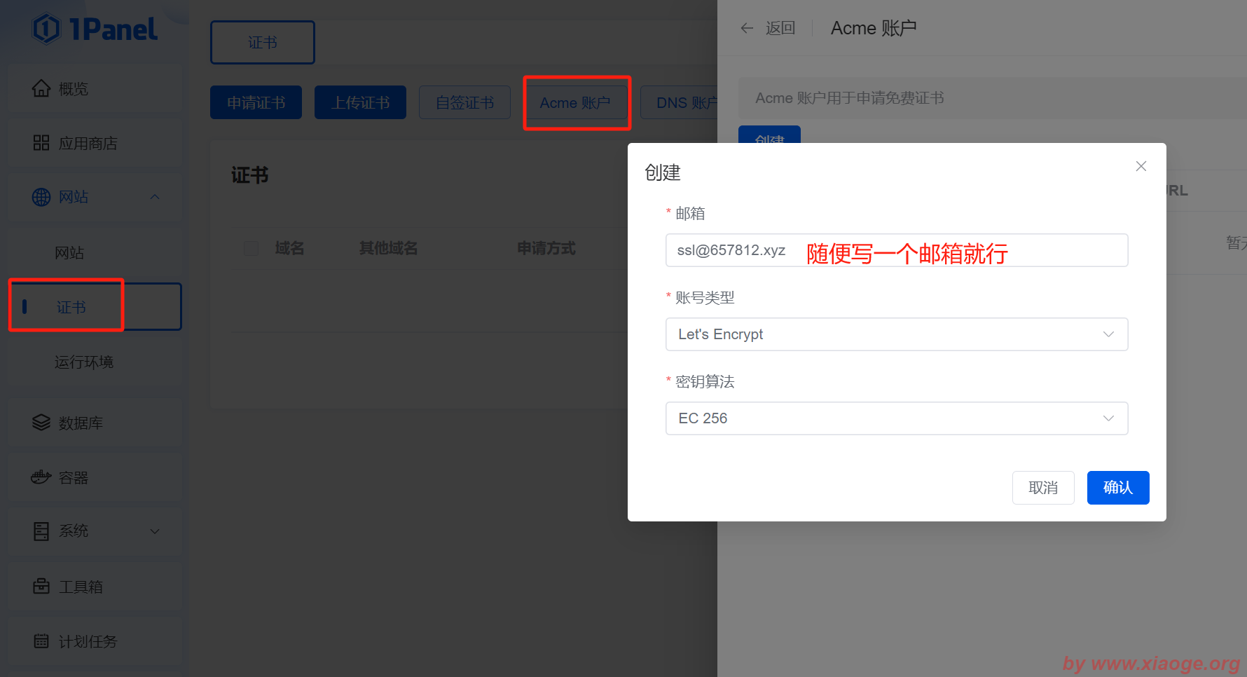增加Acme 账户:【网站】-【证书】-【Acme 账户】,邮箱随便写一个