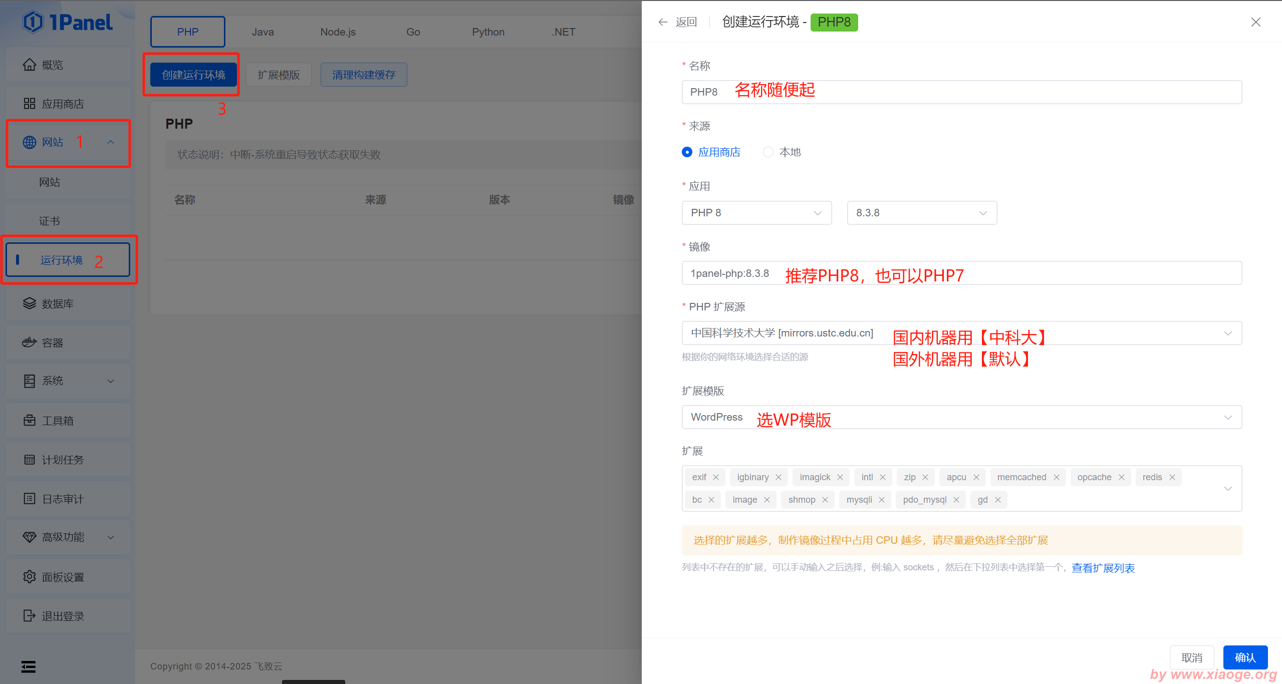 而 1Panel 的是以 docker 的形式部署的,WordPress 的官方 docker 镜像缺少了一些 PHP拓展,安装拓展麻烦且容易出错;本文将介绍 1Panel 上部署“满血” WordPress 的方式。