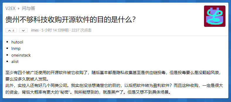 接盘公司被曝为“贵州不够科技有限公司”,此前已疑似接手多个开源项目(如 Hutool、Oneinstack、LNMP 等),均伴随权限修改、代码闭源倾向、广告植入或隐私收集等争议,被部分网友质疑存在“供应链投毒”前科。