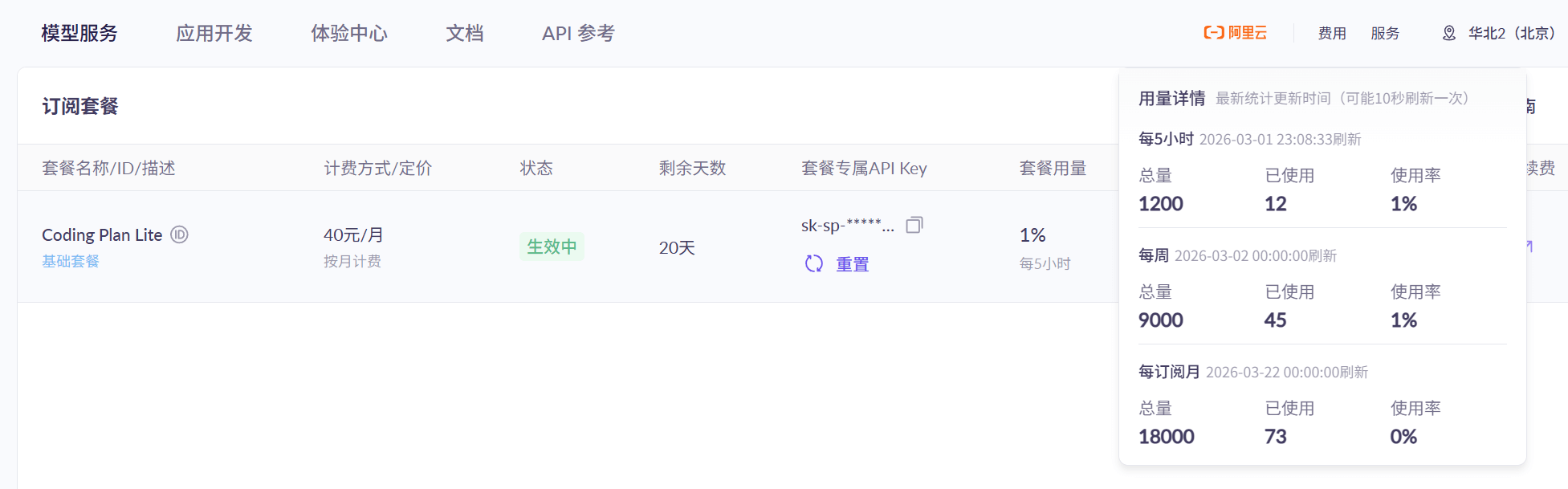 https://bailian.console.aliyun.com/cn-beijing/?tab=model#/efm/coding_plan 页面,看到用量情况。