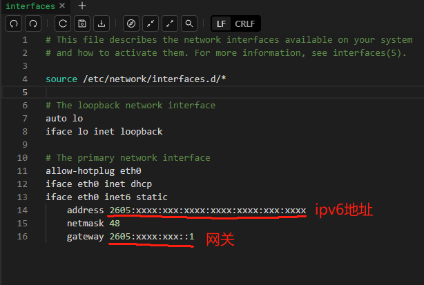 用你熟悉的编辑器将 ipv6地址 和 ipv6网关 添加到 /etc/network/interfaces (自行替换地址)