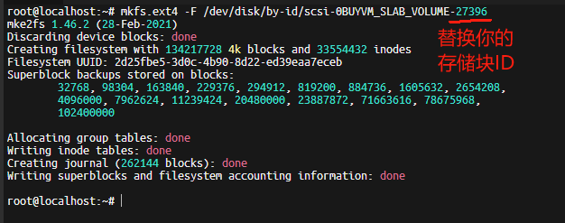 mkfs.ext4 -F /dev/disk/by-id/scsi-0BUYVM_SLAB_VOLUME-123456