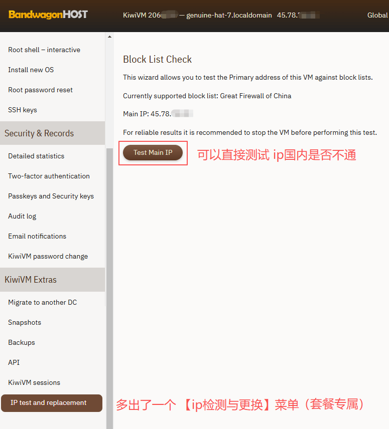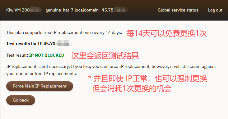 更换IP入口在 kiwivm 后台,最下方即可看到,且目前为套餐专属