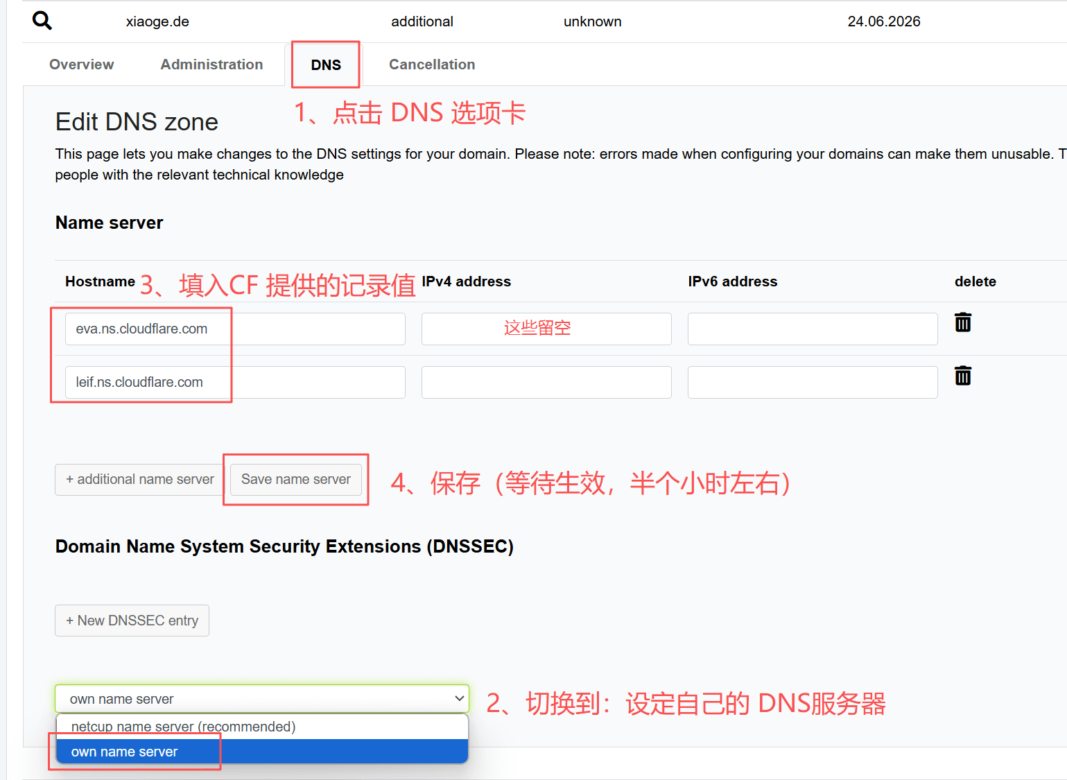 在 DNS 选项中,下方切换到 own name server (自有域名服务器),填入CF 提供的 NS 记录值,保存即可~