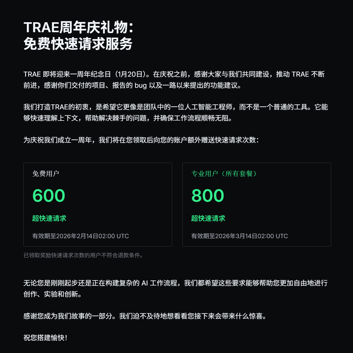 TRAE 即将迎来一周年纪念日(1月20日)。为庆祝成立一周年,向您的账户赠送快速请求次数。